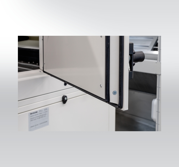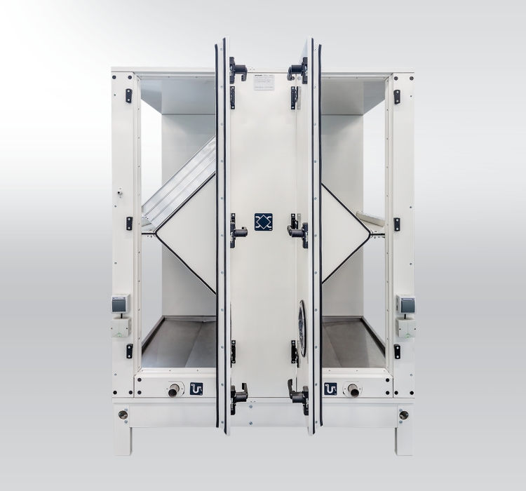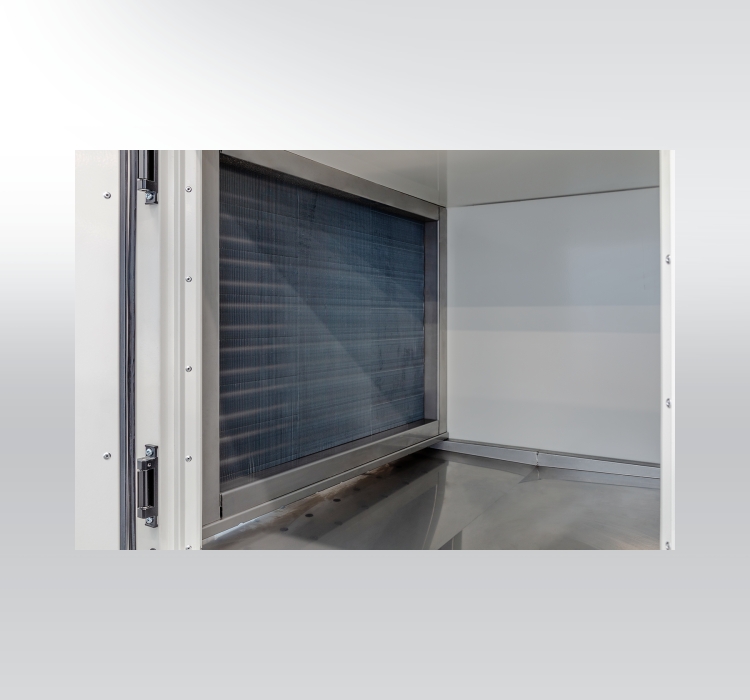 - binnenruimtes zijn technisch aangepast aan alle eisen van de hygiënische normen (bijv. aanvoerfilter voorzien van een lekbak voor condens afvoer, alle lekbakken voor condens afvoer uitgevoerd in een speciale 3D-vormgeving, afdichting van de deur zonder lijm en afneembaar ten behoeve van desinfectie e.d.)