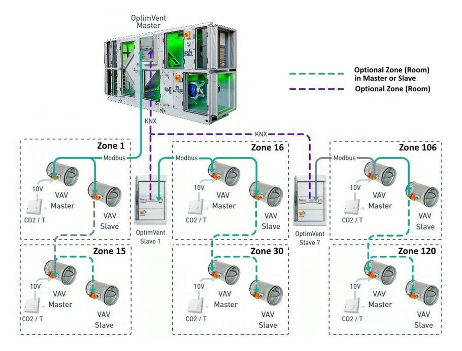 Optimalisatie van het opgenomen ventilator vermogen van de luchtbehandelingskast kan nauwkeurig geregeld worden bij toepassing van variabel volume regelaars, als het ventilator werkpunt aangepast wordt op basis van actuele data afkomstig van de variabel volume regelaars (VAV's). Als de luchtbehandelingskast actief samenwerkt met de VAV regelaars, ontstaat er een grote reductie van het energieverbruik van de ventilatoren wat uiteraard resulteert in een gunstig effect op de operationele kosten van het luchtbehandelingssysteem. Automatische ventilator regeling zorgt voor een optimale ratio tussen luchtvolume en het energieverbruik. De werking van het OptimVent systeem resulteert in een significante daling van het drukverlies in het VAV systeem en draagt naast de benodigde energiereductie ook zorg voor een daling van het geluidsniveau in de comfort zone(s).
